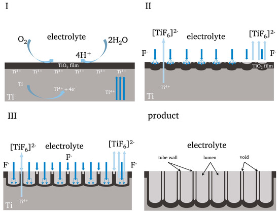 Based on above results and published research, we proposed a possible synthesis and growth mechanism of TiO2NTAs in the perspective of an applied electric field [9,43,44,45]. The formation of TiO2NTAs is a complex process involving physics, chemistry, and especially electrochemistry. The background of this mechanism is that the Ti mesh is connected to the anode of the cell, and the applied voltage (definite value) is added. The electrolyte is a mixture of organic solvent, water and F− ions (usually NH4F). According to the field-assisted dissolution mechanism [46,47], the growth process of nanotubes can be roughly divided into three stages (Figure 9).