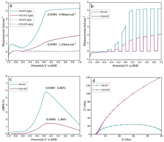 (a) The LSV curve of P0-NT and P10-NT in the light and dark; (b) photocurrent response curves of TiO2NTAs; (c) ABPE curves of TiO2NTAs P0-NT and P10-NT; and (d) the electrochemical impedance spectrum of TiO2NTAs P0-NT and P10-NT.