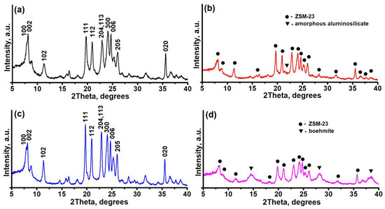 X-ray diffraction patterns of granular and powdered ZSM-23 zeolite samples: (a)—ZSM-23PW, (b)—ZSM-23GR, (c)—ZSM-23WB, and (d)—ZSM-23BDp.