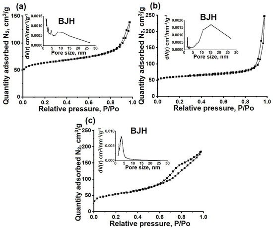Nitrogen adsorption–desorption isotherms and pore size distribution (BJH) of granular and powdered ZSM-23 zeolite samples: (a) ZSM-23PW, (b) ZSM-23WB, and (c) ZSM-23BD.
