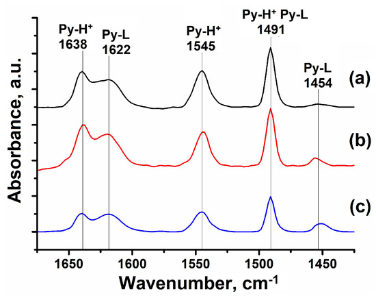 IR spectra of adsorbed pyridine for granular and powdered ZSM-23 zeolite samples: (a) HZSM-23PW, (b) HZSM-23WB, and (c) HZSM-23BD.