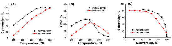 Before the reaction, the catalyst fraction was reduced under a hydrogen flow at 400 °C for 5 h. The samples promoted with 0.5% Pt are designated as Pt/ZSM-23WB and Pt/ZSM-23BD, respectively.