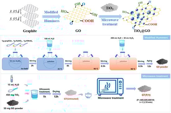 Preparation diagram of microwave-modified GO/TiO2 hybrids.