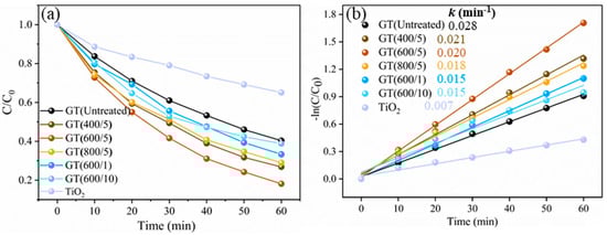 The catalytic activities of the GO/TiO2 composite photocatalyst samples with different treatment times and microwave powers are depicted in Figure 3a. The photodegradation reaction rate of RhB followed the series: GT(600/5) > GT(400/5) > GT(800/5) > GT(600/1) > GT(600/10) > GT(Untreated) > TiO2. Obviously, the catalytic effects of the samples modified by microwave treatment were better than those of the untreated samples, which confirmed the advantages of microwave field processing. Specifically, throughout the whole photocatalysis, the catalytic performance of GT(600/5) was stable, achieving the highest degradation rate of 81.85% and the optimum reaction rate constant of 0.028 min−1, which is about four times higher than that of pure TiO2 nanoparticles. Furthermore, according to Figure 3b, the reaction rate constant of the composite GT(Untreated) without microwave treatment was only 0.015 min−1, and the k value was relatively lower in microwave treated samples. On the whole, 600 W microwave power and 5 min of microwave treatment time were regarded as the optimum process conditions.