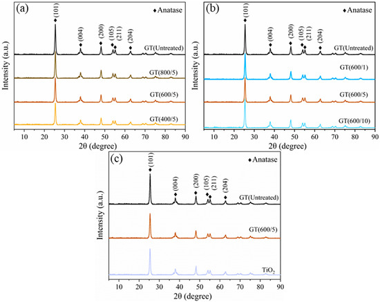 XRD characterization of GO/TiO2 photocatalysts. (a) Samples under different microwave powers; (b) samples under different microwave times; (c) comparison of the optimal GT(600/5), GT(Untreated), and pure TiO2.