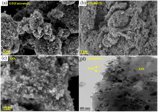 The morphologies of pure TiO2, GT(Untreated), and GT(600/5) were characterized using SEM images, as illustrated in Figure 5. Obviously, pure TiO2 nanoparticles in Figure 5c had tiny grain sizes but exhibited agglomeration and stacking phenomena. As shown in the composites, obvious differences were found between GT(Untreated) and GT(600/5), indicating changes in the surface morphology of the catalysts from the composite to the microwave-treated samples. Compared to the untreated sample in Figure 5a, the optimum sample in Figure 5b obviously exhibited less agglomeration of TiO2 particles and a relatively uniform distribution of TiO2 particles on GO, with abundant gullies and pores of different depths on the surface. Figure 5d presents a TEM image of GT(600/5), showcasing an even and tight dispersion of TiO2 nanoparticles across the GO substrate. This arrangement is advantageous for the creation of photogenerated charge carriers and increases the effective specific surface area, which is conducive to the photocatalytic degradation process.