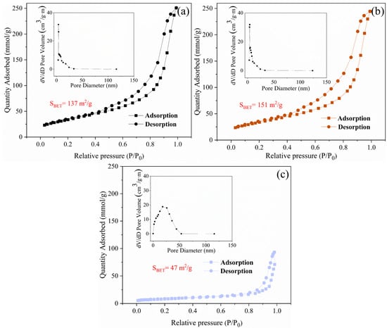N2 adsorption–desorption isotherms of TiO2 and GO/TiO2 photocatalysts, with inserts of aperture distribution. (a) GT(Untreated); (b) GT(600/5); (c) TiO2.