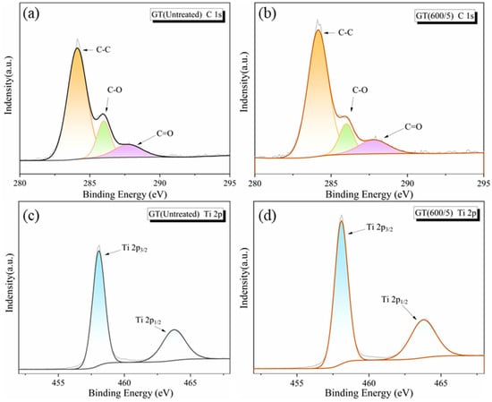 Figure 8 displays the high resolution XPS spectra of C 1s and Ti 2p in the samples. Through the deconvolution fitting of C 1s patterns, three peaks attributed to C-C, C-O, and C=O were obtained, and the absorption intensity of C=O in every sample was quite weak, indicating a small amount of unreduced carboxyl groups in the hybrids. Based on the peak intensity area, the content of C-C in GT(600/5) rose compared to GT(Untreated), possibly due to more C atoms on GO presenting a stable sp2 orbit under microwave treatment [36,37]. Thus, the macroscopic layered structure of graphene was more obvious, which can be also confirmed by Raman and SEM analysis. As for the Ti 2p spectra of the composites, the Ti 2p1/2 and Ti 2p3/2 peaks of TiO2 were assigned to 463.8 eV and 458.1 eV, respectively. After calibration, the chemical valence state of the dual-state peak corresponded to Ti4+, suggesting that microwave modification had no effect on the valence state of the Ti element [38].