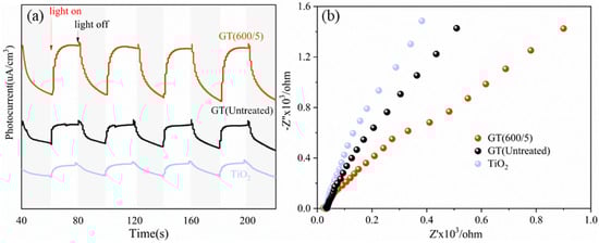 To investigate the separation and transfer efficiency of electron-hole pairs in GO/TiO2 photocatalysts, the optoelectronic characterizations, including transient photocurrent response experiments and EIS tests, were conducted, as displayed in Figure 9. Compared to pure TiO2, the coupling with GO improved the separation efficiency of electron-hole pairs, as indicated by the better current response in Figure 9a and the smaller impedance in Figure 9b. Furthermore, for microwave-modified samples, GT(600/5) exhibited a higher photocurrent intensity than GT(Untreated), suggesting quicker separation and transfer efficiency of photogenerated carriers. A similar trend was observed in the EIS test in Figure 9b, where the GT(600/5) exhibited a smaller arc radius of the resistance signal, implying reduced electron-transfer resistance due to the microwave field.