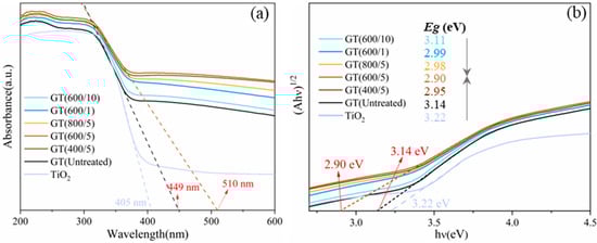 The optical absorbance abilities of pure TiO2 and as-obtained GO/TiO2 samples were examined using UV-Vis diffuse reflectance spectroscopy (DRS), as shown in Figure 10a. As observed from the DRS spectra, the absorption wavelength of the catalyst series was expanded to more than 400 nm (visible light region) compared to pure TiO2, exhibiting a broader response spectrum range and excellent visible light activity. In addition, a red shift was observed in the absorption spectra of the samples after microwave treatment, indicating that longer wavelengths of light were being absorbed. In particular, the GT(600/5) sample with the best photocatalytic effect, had the maximum light response wavelength at 510 nm. The corresponding bandgap energy value was calculated using the Kubelka–Munk (KM) equation [39], as depicted in Figure 10b. Obviously, the bandgap energies of the samples after microwave treatment narrowed to different degrees, compared to the untreated composite GT(Untreated) (3.14 eV) and pure TiO2 (3.22 eV). Of note, the narrowing trend of the bandgap in the GO/TiO2 samples was consistent with both the photoresponse in UV-Vis DRS and the photocatalytic performance. In particular, the bandgap of the GT(600/5) sample was calculated to be 2.90 eV, which exhibited the best photocatalytic effect, aligning with the previous detection results. In summary, DRS detection revealed that microwave treatment can further broaden the response spectrum range and narrow the bandgap energy of the hybrid photocatalyst, thereby improving the light utilization efficiency of the catalysts and promoting the catalytic effect.