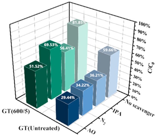 To investigate the photocatalytic mechanism of GO/TiO2 catalysts, radical trapping experiments were conducted, as shown in Figure 11. AO, N2, and IPA served as radical scavengers to capture h+, •O2−, and •OH, respectively. Apparently, for GT(600/5), in the presence of AO/IPA, the degradation of RhB significantly declined to 51.52% and 56.41%, respectively, suggesting the important role of holes and hydroxyl radicals. Of note, IPA has a greater impact on the scavenging of •OH in GT(600/5) than in GT(Untreated), implying that more hydroxyl radicals exist in GT(600/5) due to microwave treatment.