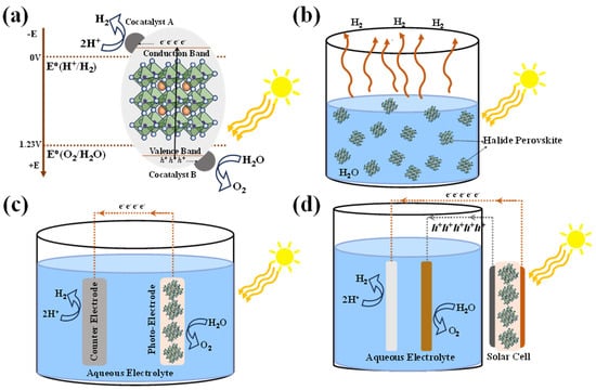 HP-based water splitting process and systems. (a) The process of photocatalytic water splitting employing two cocatalysts, A and B-cocatalyst. A is responsible for the H2O oxidation into O2 and cocatalyst B is responsible for the hydrogen evolution from the reduction of the H+ in the oxidation process. (b) Photocatalysis system, showing the dispersed photocatalyst in an aqueous medium. (c) Photo-electrocatalytic system, showing the perovskite-based photoelectrode, counter and reference electrodes immersed in the aqueous medium. (d) Photovoltaic-electrocatalytic system, showing the (perovskite-based) solar cell electrically connected to aqueous medium through the electrodes immersed in the medium.