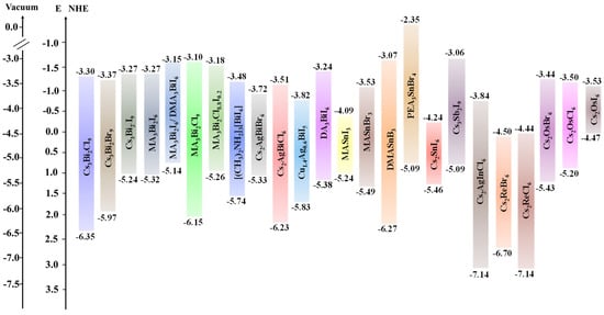 Figure 6 shows the bandgap alignment of various Pb-free HPs vs the NHE, highlighting those that showed promising results in solar-driven hydrogen generation from water or aqueous solutions.