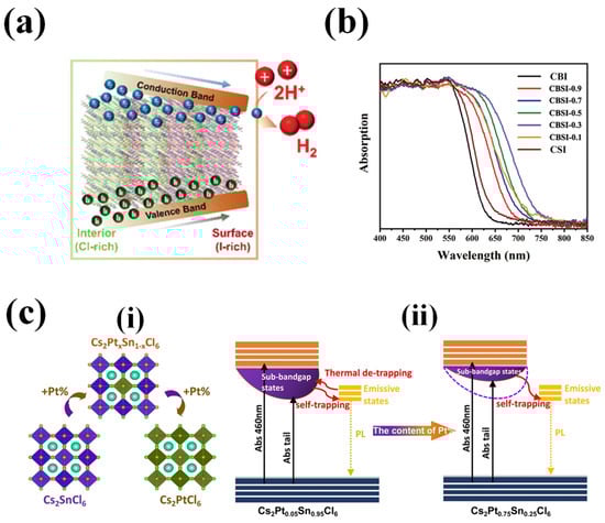 Compositional Engineering: (a) Schematic of Interfacial interaction of MA3Bi2Cl9−xIx with the bandgap funnel structure. Reproduced with permission: Copyright 2022, Wiley-VCH []. (b) Absorption spectra of the as-prepared Cs3Bi2xSb2−2xI9 (x = 0.9, 0.7, 0.5, 0.3, 0.1). Reproduced with permission: Copyright 2020, Wiley-VCH []. (c) (i). Crystal structure and transformation relationship of Cs2PtxSn1−xCl6. (ii). Charge-carrier dynamics model of Cs2Pt0.05Sn0.95Cl6 and Cs2Pt0.75Sn0.25Cl6. Reproduced with permission: Copyright 2021, Wiley-VCH [].