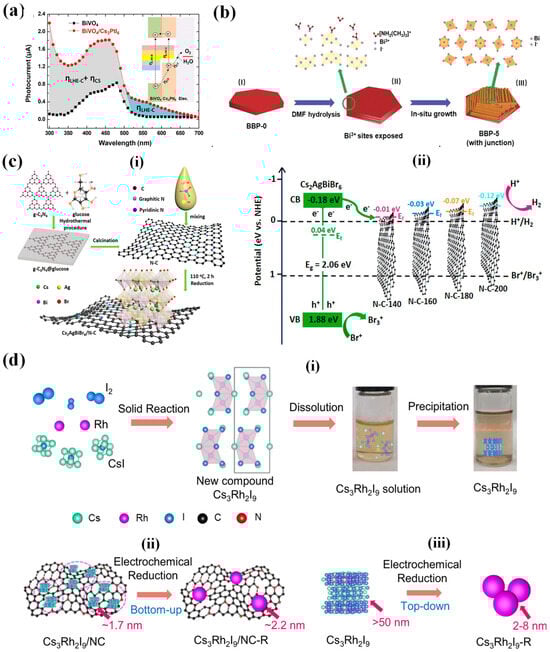 - Tang, Y.; Mak, C.H.; Liu, R.; Wang, Z.; Ji, L.; Song, H.; Tan, C.; Barrière, F.; Hsu, H. Bismuth-based perovskite heterostructures: In Situ formation of bismuth-based perovskite heterostructures for high-performance cocatalyst-free photocatalytic hydrogen evolution. Adv. Funct. Mater. 2020, 30, 2006919. [Google Scholar] [CrossRef]
