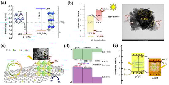 Effective charge separation by suppressing the recombination losses is one of the key factors to improve the photocatalytic (photoelectrochemical) activity of the hydrogen generation/production system. The electron–hole recombination is an inevitable phenomenon due to the Coulombic force between oppositely polar charges, moreover this swift process, with time limited to nanoseconds, is challenging to regulate. However, this can be minimized by engineering the photocatalyst and optimizing the system. Introducing heterojunctions is a classic and promising strategy to address the (surface) recombination in photocatalysts and is well explored in traditional solar-driven hydrogen-generation systems. Band alignment plays a crucial role in developing an appropriate heterojunction that ensures rapid charge separation, thereby improving the overall photocatalytic performance of the system. Lead-perovskite heterojunctions with TiO2, rGO, g-C3N4. etc., have been investigated and employed for photocatalytic activities, including hydrogen generation, CO reduction, and organic contaminants degradation [,,,,,,]. These studies have inspired researchers to adapt lead-free perovskite-based heterojunction architectures for hydrogen generation.