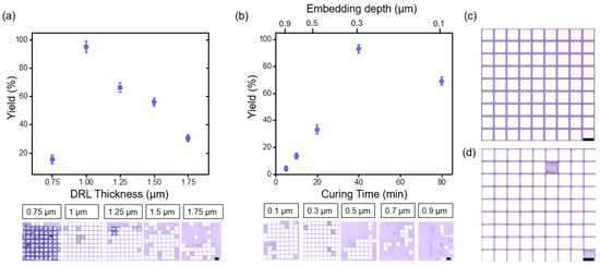 Transfer yield as a function of (a) the DRL thickness and (b) the curing time, with the corresponding embedding depth indicated on the secondary X-axis above. The error bars in these graphs represent the standard deviations. OM images of (c) the donor substrate before transfer and (d) the receiver substrate after transfer with a 97% transfer yield. The black scale bar corresponds to 100 μm.