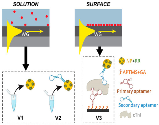Summary of the validation steps performed using waveguide-assisted SERS detection. V1 used the waveguide device and the colloidal NPs to detect the SERS signal from the Raman reporters in solution. V2 used the waveguide device to detect the signal from the free-floating aptamer-conjugated RR-NP in solution. V3 utilized the immobilized primary aptamer to trap the aptamer-conjugated RR-NP on the waveguide surface for cTnI detection. NP: nanoparticle. RR: Raman reporter.