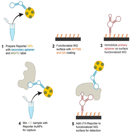 Illustration showing the preparation steps and the components of the aptamer sandwich assay that detected the biomarker cTnI using a waveguide (WG)-assisted SERS device.