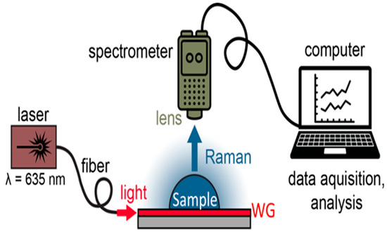 Experimental set-up of the Raman measurements using the optical waveguide device. Light from a λ = 635 nm laser was coupled into a single mode fiber using a reflective lens and then into the waveguide through the butt-coupling method. Raman signals excited by the WG was collected by a handheld Raman spectrometer with a lens adapter attachment.