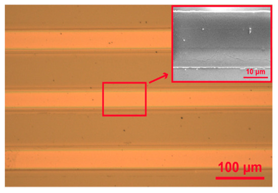 Optical image of AlN ridge waveguides. Inset shows an SEM image of a single waveguide with straight edges and a smooth surface.