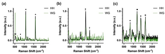 SERS spectra of (a) 1 mM 4-MBA, (b) 1 mM DTNB, and (c) 0.5 µM MGITC acquired using the AgNP-on-waveguide platform (WG) and the handheld spectrometer (HH) configurations. Assigned characteristic features of each compound are marked.