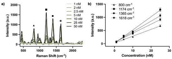 To test the performance of the device in quantitative analysis, AgNP solutions with different concentrations of MGITC (1 nM, 2 nM, 2.5 nM, 5 nM, 10 nM, 25 nM, 50 nM) were prepared according to the previously described methods. The testing set-up and experimental parameters, including excitation power and integration time, were kept the same from the initial sensing characterization and maintained throughout the concentration measurements. The SERS spectra of various MGITC concentrations obtained by the waveguide device is shown in Figure 9a. The most intense characteristic peaks, located at 800 cm−1 (▲), 1174 cm−1 (■), 1365 cm−1 (●), and 1618 cm−1 (⁕) were selected for more detailed evaluation. Figure 9b displays the plot of SERS intensity versus reporter concentration at those Raman peaks. There is a linear dependence between the MGITC concentration and the SERS intensity within the concentration range between 1 nM and 25 nM. The low detection limit was found to be 1 nM.