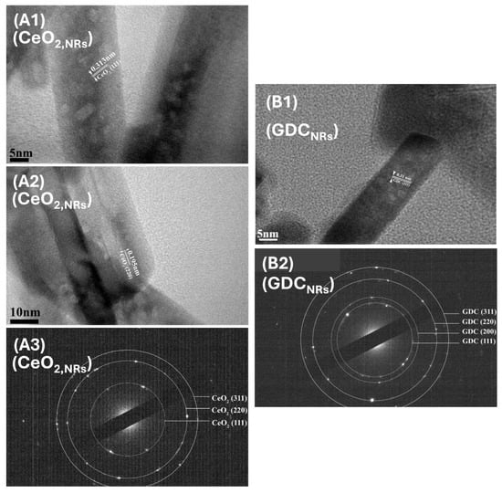 Higher magnification HRTEM and the corresponding electron diffraction (SAED) images of the selected areas of CeO2 and GDC supports (Figure 2 and Figure 3) reveal the crystalline structure of all samples, proving that both synthesis methods lead to the formation of grains in the nanoscale. The distances between the lattice fringes were measured to be 0.313, 0.270 and 0.195 nm, corresponding to the (111), (200) and (220) planes of CeO2 (JCPDS PDF 00-002-1306) and GDC (JCPDS PDF 01-075-0162), respectively. The CeO2 nanorods predominantly exposed the (111) and (220) crystal planes, while nanorods preferentially grew along (111), as shown in Figure 2(A1–A3); this agrees with similar findings in the literature [48]. The latter was also observed for GDC nanorods shown in Figure 2(B1,B2). The interplanar distance of the (111) crystal plane was measured to be 0.313 nm for both CeO2 nanorods (Figure 2(A1)) and nanograins (Figure 3(A1)), while for GDC nanorods and nanograins, the distance was slightly lower, 0.310 nm. This may be attributed to the gadolinium doping into the CeO2 lattice, which has a smaller ionic radius (Gd+3 (1.05 Å), Ce+3 (1.14 Å)) compared to Ce [49].