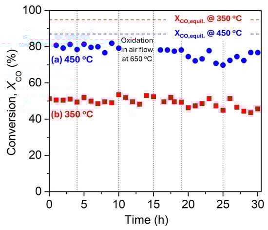The TOS stability of Pt/GDCNRs, which exhibited superior performance, was investigated at two temperatures, 450 °C and 350 °C, following two different protocols, and the results obtained are presented in Figure 8. In the first protocol (Figure 8a), the catalyst was first reduced in situ at 300 °C under H2 flow for 1 h, followed by heating to 450 °C in He and then exposure to the reaction mixture. As can be seen, the conversion of CO remained constant and equal to ~80% for 10 h on stream. The catalyst was then subjected to a subsequent thermal aging at oxidizing conditions (i.e., exposed in air flow at 650 °C for 5 h), then reactivated by hydrogen flow at 300 °C for 1 h and re-exposed to the same WGS reaction conditions in order to evaluate its aging tolerance—such procedures are often used in practical applications as catalyst regeneration methods. It was found that XCO fluctuates between 76 and 82%, implying that Pt/GDCNRs presents excellent stability even after oxidative thermal aging. A total period of 30 h was imposed in these TOS and thermal aging stability tests (Figure 8a).