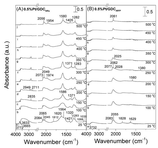 Operando DRIFTS experiments were carried out under WGS reaction conditions to study the effect of support morphology on the formation of reaction intermediates and the reaction pathway. The spectra recorded over the most active Pt/GDCNRs catalyst following its interaction with a 1% CO + 3.5% H2O (in He) mixture at 25 °C and stepwise heating at 500 °C are presented in Figure 9A. The spectrum obtained at 25 °C (trace a) was characterized by two bands in the ν(CO) region located at 2084 and 2065 cm−1, followed by a shoulder at 2045 cm−1, which can be attributed to CO linearly adsorbed on Pt terrace and step-edge sites, respectively, and a low frequency band at 1812 cm−1, previously assigned to bridge-bonded CO at Pt terrace sites [62,63,64,65,66,67,68]. It should be noted that the shoulder at 2045 cm−1 may also contain contributions from carbonyls formed on platinum kink sites [62,63,64,65].