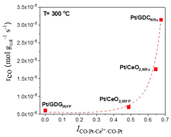 Reaction rate at 300 °C for the studied catalysts as a function of the relative intensity (I) of the CO-Pt-Ce3+ band (1960–1980 cm−1).