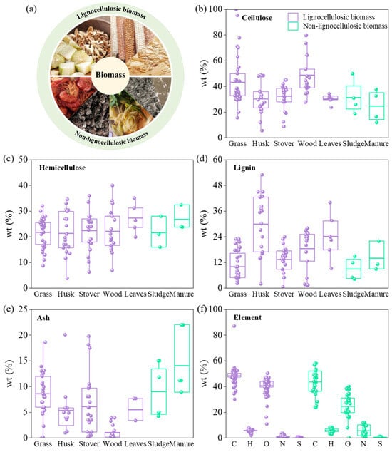 Figure 1. (a) Biomass classification. (b) Cellulose, (c) hemicellulose, (d) lignin, and (e) ash mass ratios for different types of biomass, and (f) average elemental mass ratios for both types of biomass. (Data from the Phyllis2 database).