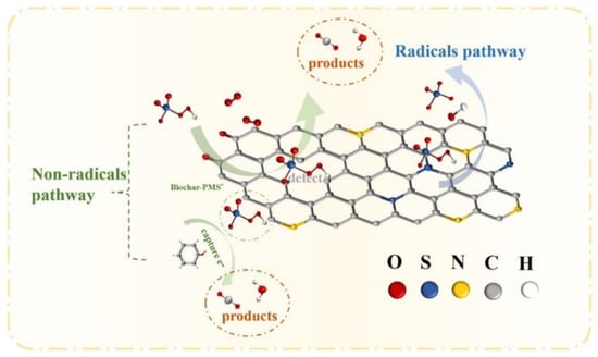 Metal leaching is a drawback of metal catalysts, so metal-free, carbon-based materials are being developed for PMS activation. Heteroatom doping (e.g., nitrogen, sulfur) has been shown to significantly improve PMS activation efficiency [147]. However, carbon materials are often inert, limiting their catalytic performance. Ye et al. found that nitrogen-doped, graphitized BC catalysts effectively degrade pollutants through a non-radical pathway, which is less affected by complex wastewater compositions [123]. Fan et al. used Ginkgo biloba leaves to prepare BC that efficiently activated PMS for phenol degradation [28]. The results showed that PMS adsorption was facilitated by oxygen, sulfur, and nitrogen groups on the BC. Sulfur functional groups increase the number of positively charged carbon atoms, promoting O-O bond cleavage and radical generation during PMS activation. Additionally, PMS forms adducts with C-O groups, which then produce 1O2 for the non-radical degradation of phenol (Figure 5).