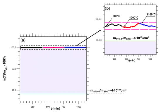 Mass loss of an STO crystal during thermal reduction performed subsequently at 900, 1000, and 1100 °C determined by thermogravimetric analysis ((a) overview, (b) magnification). The hatched area shows the hypothetical mass loss expected from the carrier concentration, measured by the Hall effect (4 × 1017–1019 carriers/cm3 [11]). The measured mass loss is below the resolution limit of the apparatus (±0.0005%), illustrating the discrepancy between the measurement and previous assumptions.