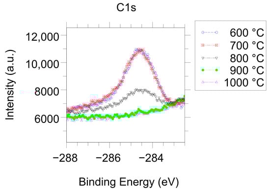 Operando XPS analysis of the C1s core line during reduction of an STO crystal under UHV conditions showing carbon removal from the surface above 700–800 °C.