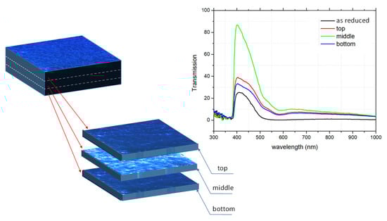 So why do we need only such a low concentration of oxygen defects to “switch” the crystal to a metallic or superconducting state for both types of doping, despite the dominant role of d1 electrons? This paradox can be understood if we consider the crystal as an inhomogeneous object before and after the removal of oxygen. For the optimal thermally-reduced STO, the reduction time should be coordinated with the position of the resistance minimum of the reduction curve for each temperature (see [64]). Such a crystal achieves optimal electrical conductivity and changes its color to grey or dark blue. At this point, we need to accept that prolonged annealing under constant oxygen partial pressure does not lead to the establishment of an equilibrium state as could be expected from point defect chemistry [65]. Due to the self-healing effect, the prolongation of the annealing time renders the crystal more transparent and the electrical conductivity decreases again. This means we have only a short time interval for reaching a maximal reduction state of the STO crystal [18]. However, if we look closely at such a maximally reduced crystal, the transparency is not reduced in the whole crystal. As can be seen from the tomographic optical investigation presented in Figure 3, the major contribution to the absorption due to free d carriers introduced during the reduction process stems from the surface region. Only the plates containing the surface regions are responsible for the strong optical absorption.