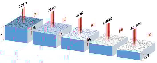 Illustration of resistance tomography measured with the micro-Valdes method for optimally reduced STO realized by subsequent mechanical removal of the surface (a–e). In each polishing step, a layer with a thickness of d1 = d2 = d3 ≈ 10 µm was removed. The major contribution to the global resistance comes from the last few dozens of micrometers-thin surface regions (see difference between (a,b)). The resistance of the reduced crystals determined after removal of 3 layers with a total thickness of about 30 µm (here 2.8 MΩ) is of the same order as after polishing half of the crystal (3.35 MΩ in (e), d/2 = 250 µm).