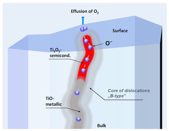 Illustration of a core of dislocation during the reduction process. Based on HRTEM, ChemiSTEM, and EELS investigations, the local chemical composition of a core has to be regarded as a combination of segments with different content of oxygen typical for low Magnéli phases or low Ti oxides (here TiO). At high temperatures and low partial pressure of oxygen, the maximum deoxidation rate occurs in the segment with highest oxygen stoichiometry (e.g., Ti3O5 [31]).