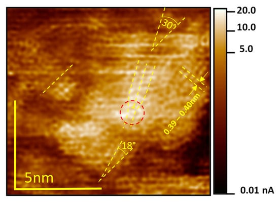 LC-AFM map of the electrical conductivity near a bundle of filaments. The red circle marks the conductivity increase close to the dislocation’s position. The change in the orientation of the blocs around the highly conducting area (see the different twisting of the orientation of the rows of atoms marked with yellow lines; here, 18° and 30°) suggests a kind of structural transformation into low TiO oxides. During scanning, a polarization of only 2 mV was used. The data are original data, and only a low-pass filter was used for the reduction of high frequency noise. A similar atomic resolution was observed for many scans and different regions of thermally reduced crystals.