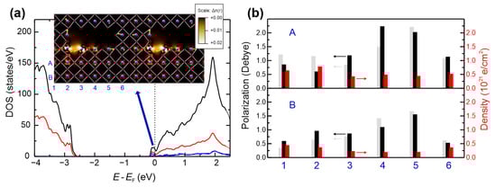 DFT simulation of neighboring one-dimensional extended defects in STO. (a) Illustration of the electronic structure. The inset shows the relaxed structure with oxygen atoms marked in red and Ti atoms in blue. The vacancy-induced states are visible in the density of states (DOS) at the bottom of the conduction band. The total DOS is shown in black, the local DOS on the Ti atoms adjacent to the vacancy in blue, and the interstitial DOS (between the atomic spheres) in red. A cut through the induced charge density is shown in the inset underlying the atomic structure. Bright areas indicate a high electronic density. Large local polarizations are indicated by yellow arrows. (b) Polarization (black) and defect-induced charge densities (red) in STO near the extended defect. The vertical and horizontal positions of the Ti atoms are labelled with (A, B) and (1, …, 6), respectively, and are visualized in the inset of (a). For comparison, the size of the local polarizations in an extended defect without the oxygen vacancy are indicated by the grey bars.