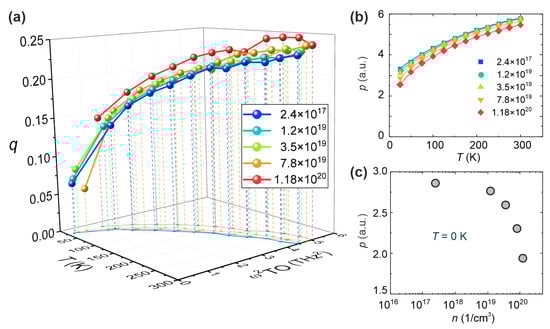The essential phonons in STO are the lowest lying soft transverse optic and acoustic modes [4]. Interrelation between these two branches is the signature of the formation of local polar nano-regions. By calculating the phonon group velocities for the two considered branches [93], these become very apparent and yield the momentum at which the local, spatially-confined soft modes occur, and where the scattering between the two modes is the strongest [94]. The corresponding squared polar optic mode frequency is displayed in Figure 12a as a function of carrier concentration n, temperature T, and momentum q. As is obvious from the figure, this local polar mode softens with decreasing temperature and moves to lower momentum values, but never reaches the homogeneous q = 0 limit [75]. In addition, the softening is reduced with increasing carrier concentration [95], and its momentum space decreases, indicating the growing spatial confinement and the shrinking of the polar nano-domains. In contrast to a long wavelength “true” soft mode, it is nonlinearly dependent on temperature below ≈150 K. As , the dielectric permittivity ε0 is extracted from it, and is approximately 40% smaller than the long wavelength limit, but still temperature dependent, typical for an almost ferroelectric compound [96].