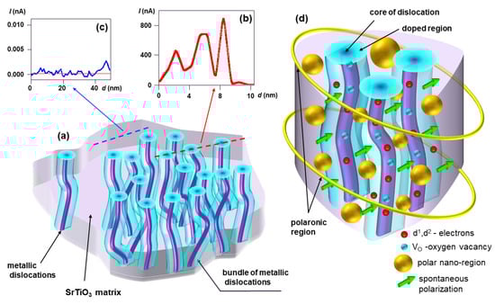 Due to the mechanical polishing of the surface of the STO crystal, a network of extended defects (especially edge dislocations) is introduced in a surface region with a thickness of approximately 30 µm. This network possesses a ranking character. The dislocation density is 1010/cm2 for epi-polished surfaces and 1012/cm2 for a rough surface (e.g., after cutting). In the deeper part of the surface region, the dislocation density reaches the original density of dislocations in the virgin crystal, 106–107/cm2 [31,67]. This progressive reduction in the density of dislocations with increasing depth automatically leads to the creation of a hierarchic tree; that is, the number of branches below the nodes is smaller than above the nodes (with respect to the surface of the crystal). Since the dislocations as extended defects underlie the crystallographic rules, the conservation of the Burgers vector, which describes the distortion of the lattice caused by a dislocation [68], is required for each node where dislocations meet, i.e., the sum of the Burgers vectors must be zero at this point. The existence of a network of dislocations in the perfect matrix of the dielectric SrTiO3 crystal complicates the description of the surface region not only from the crystallographic point of view, but also regarding changes in the local chemistry/composition, electronic structure, and polarization of the dislocation core (see investigations by transition electron microscopy (TEM), electron energy loss spectroscopy (EELS), and energy dispersive X-ray spectroscopy (EDX) [69,70,71,72,73]). As a result, the interconnected dislocations in the network cause an electrical short circuit of the insulating part of the crystal.