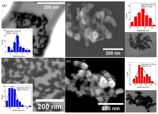 Micrographs of Pd catalysts obtained from the polyol method, without the addition of Vulcan carbon: (a) 10 ± 1 nm, BF-STEM; (b) 26 ± 7 nm, SE(U) SEM and BF-STEM; (c) 32 nm ± 4 nm, BF-STEM; and (d) 41 nm ± 9 nm, SE(U) SEM and BF-STEM.