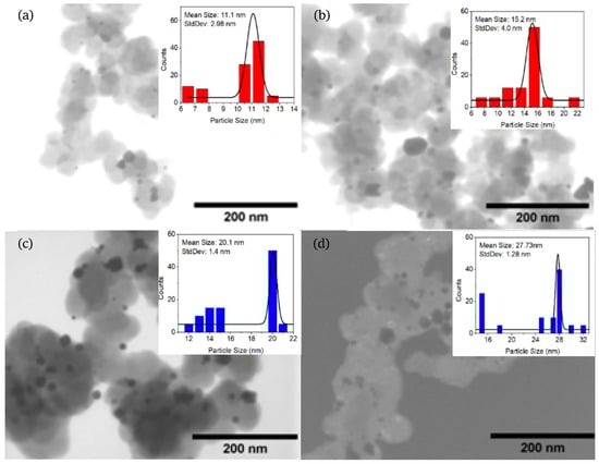 Micrographs of Pd/C electrocatalysts for different particle sizes with ascorbic acid: (a) 11 ± 3 nm, (b) 15 ± 4 nm, (c) 20 ± 1.5 nm, and (d) 28 ± 1.5 nm.
