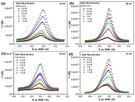 Linear sweep voltammetry for the electro-oxidation of ethanol in an alkaline medium (KOH 1 M) at a scan rate of 20 mV/s using electrocatalysts with a (a) 10, (b) 26, (c) 32, and (d) 41 nm particle size (polyol).