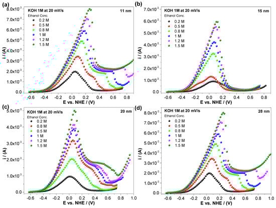 Linear sweep voltammetry for the electro-oxidation of ethanol in an alkaline medium (KOH 1 M) at a scan rate of 20 mV/s using electrocatalysts with an (a) 11, (b) 15, (c) 20, and (d) 28 nm particle size (ascorbic acid).