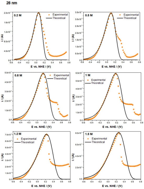 In Figure 5, we show the voltammograms with the theoretical and experimental values of the 28 nm nanoparticle mean size. For all ethanol concentrations in the steady-state oxidation zone (from the equilibrium potential to the peak potential), it was seen that the theoretical curve (black line) fits the experimental results (dots). In this region, the EOR process is governed by two primary factors: The quantity of ethanol CA, which invariably results in the formation of by-products, and the number of available active sites , which, according to the reaction mechanism described in the literature, could be described in cyclic voltammetry profiles as the location where the Pd adsorbed the hydroxyl ions Pd-OHads in ethanol electro-oxidation CV occupied by a single alcohol molecule Pd-(CH3CH2OH)ads and later bonded with another by-product like ethoxy or (CH3CO)ads [4], preventing other fresh ethanol molecules from adsorbing on.
