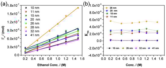 The results obtained for the number of adsorbed molecules (Γσ) and the adsorption–reaction constant (Keq) versus ethanol concentration are shown in Figure 6. A general behavior is observed for all the different particle sizes where the number of adsorbed molecules reaches higher values as the concentration of ethanol increases.