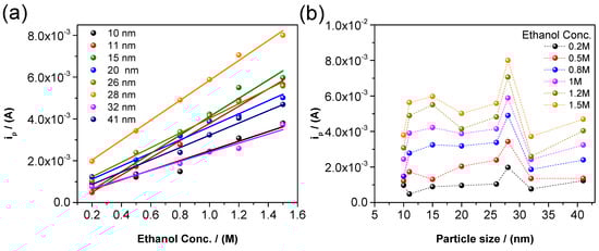Our fitting results are consistent with the peak current results, where the current increases in a continuous and linear shape until the D = 28 nm particles and decreases quickly after. The plot of the peak current vs. alcohol concentration shows a linear behavior of every sample with different particle sizes (Figure 7a and data from Supplementary Information Table S1).