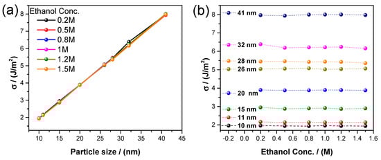 Figure 8a shows a relevant feature, that is, that the surface energy depends linearly on the particle size, as predicted by Equation (7) for all the sizes studied, and it is independent of the synthesis method, thus suggesting a universal behavior. Furthermore, the surface energy values obtained are consistent with the literature [31]. The surface energy of each particle is independent of alcohol concentration, as shown in Figure 8b.